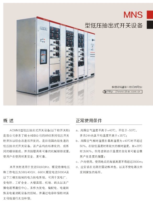 ACMNS型低(dī)壓抽出式開關設備(以下稱(chēng)開關櫃) 是我公司參考了瑞士ABB公司的MNS係列低壓開關 櫃並加以綜合改(gǎi)進(jìn)後開發的,是目前(qián)國內較新型的 低壓抽出式開關(guān)設備。該產(chǎn)品均由標準化的、成係 列的模塊組成,並且(qiě)抽屜具有可靠的機(jī)械聯鎖裝置, 使用戶(hù)在(zài)使用時更安全(quán)、更可靠。