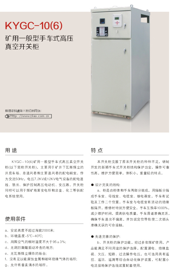KYGC- 10(6)礦用-般型手車(chē)式高壓真(zhēn)空開關櫃(以下簡稱開關櫃),主要用於礦(kuàng)井下瓦斯煤塵的井底車場、總進風巷和主要進風巷的配電峒室。作為(wéi)交流50Hz,電(diàn)壓7.2KV或12KV電氣設備的配電進線、饋出、保護控(kòng)製高壓電動機、變壓器。開關櫃同樣可以(yǐ)用於煤礦地麵變電所和冶金、化工等供配.電係統使用(yòng)。